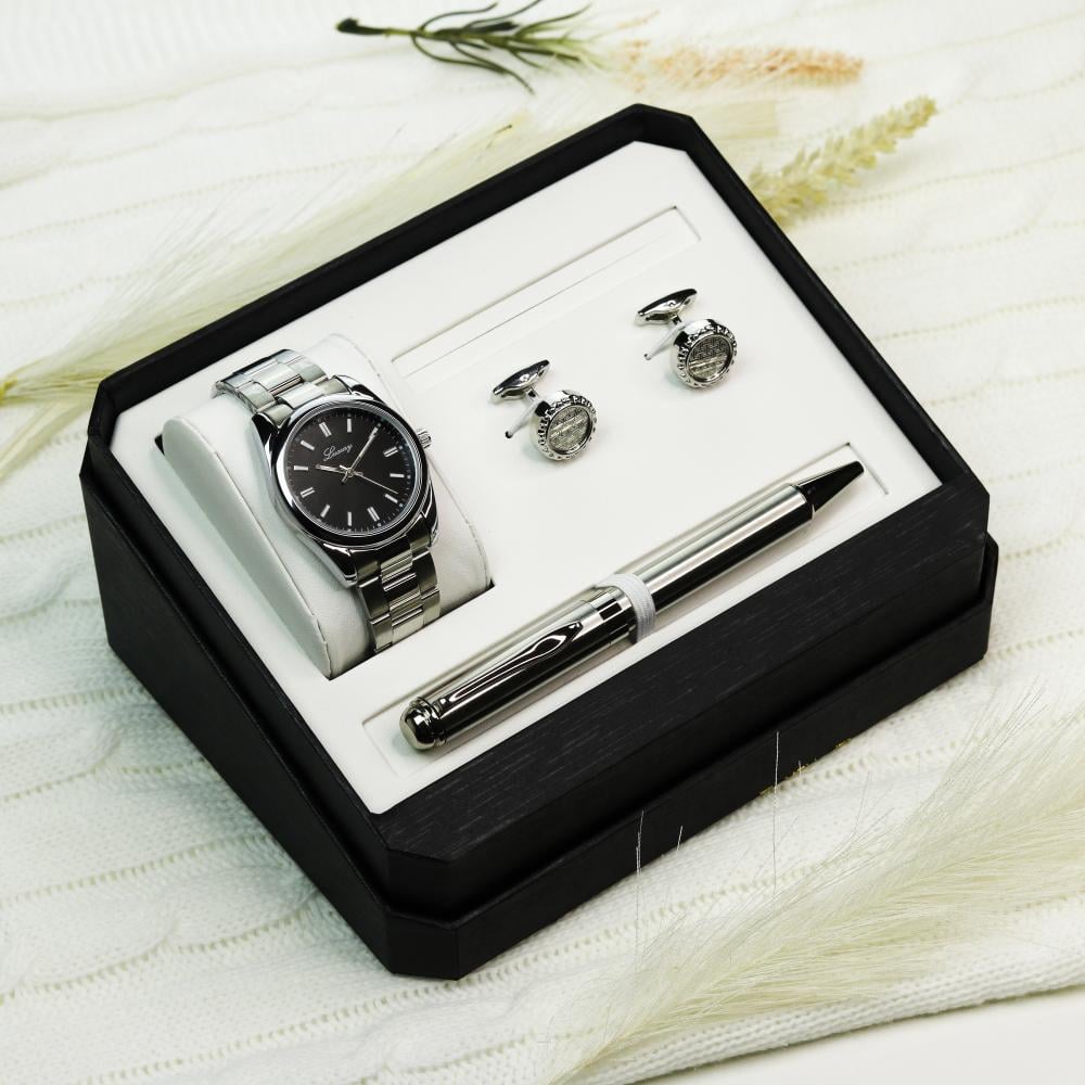 عن مجموعة هدايا أنيقة تحتوي على ساعة يد، أزرار أكمام، وقلم حبر. الساعة مصنوعة من الفولاذ المقاوم للصدأ وتتميز بمينا سوداء مع علامات ساعات بيضاء. أزرار الأكمام مصنوعة من الفولاذ المقاوم للصدأ وتحتوي على تصميم دائري مزخرف. القلم مصنوع من المعدن وله تصميم أنيق مع لمسات فضية. المجموعة موضوعة في علبة عرض سوداء مبطنة باللون الأبيض، مما يضفي عليها مظهراً فاخراً ومناسباً كهدية راقية.