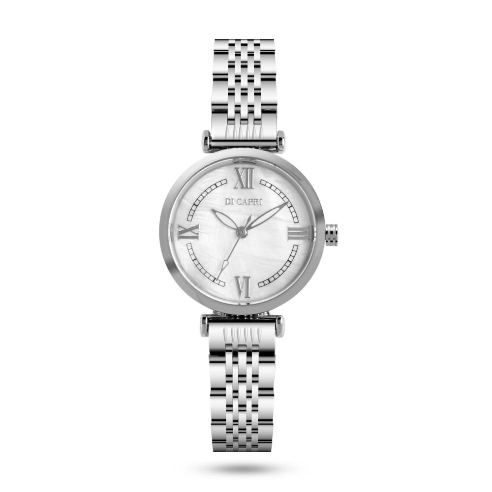 ساعة نسائية فخمة بتصميم فاخر وأناقة لا مثيل لها من ماركة "DI CAPRI". تأتي بإطار وسوار فضي مصنوع من معدن مصقول بدقة، مما يضفي مظهراً راقياً وفريداً.